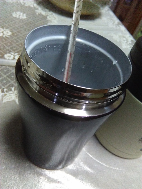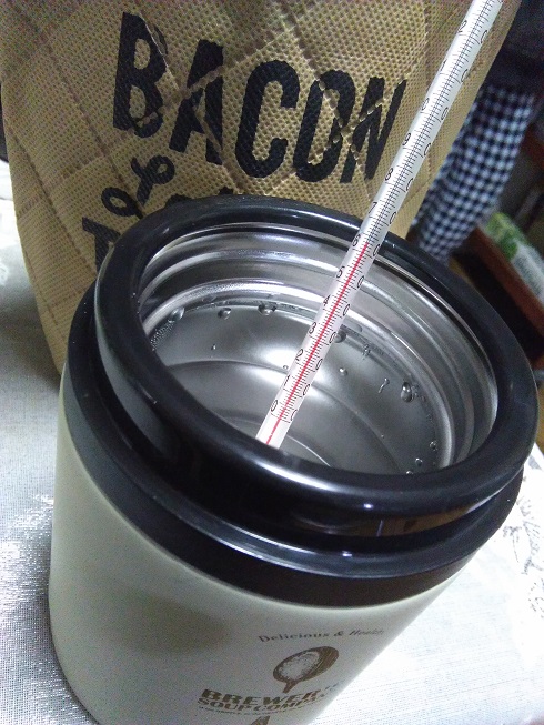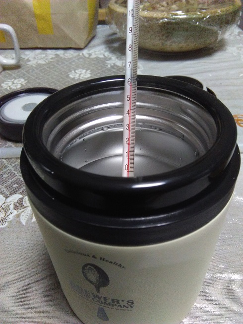 スープポットの温度比較 実測してみた その他料理 2018年02月21日 我が家はお昼はお弁当です。 そしてカレーとか豚汁とか作った日には、スープポットに入れてお弁当に持っていきます。 所でスープポットって沢山種類、メーカーがありますが、保温力の性能差ってあるのでしょうか? 保温力性能のカタログ値はどのメーカーも似たようなものです。 その割にブランドによって値段はかなり違います。 我が家ではスープポットをいくつか使ってますがあまり高いスープポットは買えず、あまり聞いたことのないホームセンターで売ってる安い奴を使っています。 なので、ちゃんとした?メーカーの高い商品とは比較実測が出来ませんが、うちにある2つのブランドの比較と同じスープポットでも保温バックに入れた場合との比較をしてみました。 スープポットの容量は一緒で0.4Lです。 沸かしたてのお湯を半分まで入れて5時間放置してみました。 まずはこのスープポット。 そしてもう一種類のスープポット。 さっきのスープポットと同じものを100均で買った保冷バックに入れてみました。 同じ場所に置いて5時間。 違いは出るのでしょうか? 待つこと五時間。温度計で実際にお湯の温度を測ってみました。 まずは最初のポット。 実測値62℃です。 冬場にこれだけ持てばいいと思います。 次のポットは 62℃です。 少しは差が出ると思いましたが全く同じでした。 最後に保温バックに入れたやつ。 63℃でした。 保温バックに入れた物だけ1℃高いですね。 と言う事で、結論からすると保温力はあまり変わらない。 保温バックは少なからず効果がある。 しかし、もっとお値段の高い奴はどうなのか??謎です。 でも高いお金出して買ってもたいして差がなかったらがっかりなので今のままでいいかな。 保温バックが効果あると言っても1℃だけ。 果たしてこの1℃をどう見るか・・・。 私的にはたいして変わらないじゃん!です。 つまりはスープポットを置いてある環境に左右されると言う事で、なるべく暖かい所に置いておくのが良いと言う事ですね。 当たり前と言えば当たり前ですが・・・・。 保温バックも100均で買った物なのでもっといい奴を使えば、もっと保温力は高いかもしれませんが、今はこの温度で十分なので良しとします。 一度実測して試してみたかったので満足です。 理科の実験みたいでたのしかったー。 [0回]PR