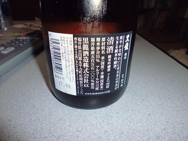 福井のお酒 純米吟醸「黒龍」 その他料理 2018年02月10日 先日、東京に遊びに行った際にお酒を飲んだ魚匠さん。 そこのお店で飲んだ「黒龍」と言うお酒が美味しかったのですが、残念ながら純米ではありませんでした。 純米酒大好きな我が家ではあれだけ旨い黒龍が純米だったらもっとうまいだろうと探してきました。 飲んでみましたらやっぱり思った通り、純米はさらに美味しかった。 切れのあるお酒ですが米のうまみを感じるさわやかなお酒です。 お刺身とかに合うお酒です。 買ってきてその日のうちにツルっと飲んじゃいました。 だいたいいつも720mlの瓶で日本酒を買うのですが、今度から一升瓶にしようかなぁー。 でもそれだと、のんべえみたいでやだなぁ。 お値段も張ってくるしね。 うーん、悩ましいところです。 [0回]PR