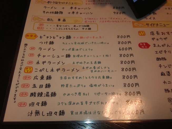 長泉の下土狩駅近くの美味しいラーメン屋 満貫(まんがん) その他料理 2018年11月21日 先日、長泉の下土狩駅前(御殿場線)にある中華屋?ラーメン屋「満貫」へ行ってまいりました。 食べログとかで見て、前から気になっていたお店です。 お店の前には駐車場ありませんが、駅の横に駐車場がありました。 お店の外見は撮り忘れちゃったのですが親しみのある外観です。 店内はあまり広くはありませんが、若い店長がテキパキと動いてます。 家族釣れもいましたが、意外にお一人様が多いように感じます。 メニューは 手書きで書かれたものが印刷されていて中々味があります。 そして気になったラーメンがこちら。 この二つが非常に気になったのですが、特に右側のびゃんびゃん麺。 物凄い画数の漢字ですが、これで「びゃん」と読むようです。 平打ちの辛い麺のようです。 悩んでこがしネギラーメンにしました。 連れ合いは あんかけが好きなので広東麺です。 さてまずは、こがしネギラーメンです。 スープは・・・・。 おー!出汁が効いてて美味しい醤油で薄味です。 でもこがしネギの香りが香ばしくてGOOD!! 麺も美味しい。 そしてこがしネギと一緒に食べると・・・。 うまーい!!! ネギの香ばしさと、焦がしたことによるねぎの甘み、そして出汁のきいた醤油スープと味わいのある麺で非常に美味しい。 びゃんびゃん麺と悩んだがこれにして良かった。 広東麺はスープを飲んだ瞬間に、ん?思ってたのと違う。 そして美味しい。 うまく説明できないけど、今まで食べた広東麺のあんかけと違う・・・・。 何が違うってわからないけど、食べた事のない美味しさ。 へー、面白いし美味しい。 何気にこの店は何食べても美味しいんじゃないかな?? さてラーメン美味しかったので今度はびゃんびゃん麺に挑戦してみようかな。 でも、この場所って普段来るところではないから、わざわざ来なきゃならない。 でも、この美味しさならわざわざ来たいかな。 美味しかったー。 [0回]PR