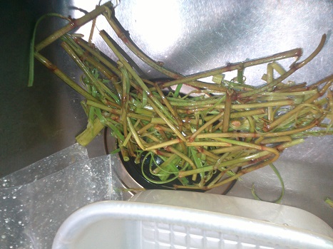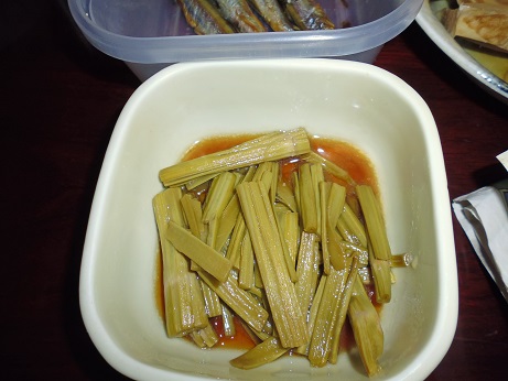 イタドリの炒め物 山菜、野菜 2017年05月18日 イタドリの炒め物 味の評価 ★★★☆☆ イタドリも春は美味しい。 柔らかめで茎の太い物を選び、葉は捨てる。 茎の皮をむいて食べやすい大きにして、塩を一つまみのお湯でサッと茹でる。 水につける。時々水を変えながら一晩アク抜きをする。 みりんとほんだし、醤油で炒める。 イタドリ自体は味のあるものではないので、美味しさは味付け次第。 それよりイタドリの良さは歯ごたえ。 独特の歯ごたえで美味い。 ちなみに茹ですぎるとこの歯ごたえが無くなるので注意。 その代わりしっかりアク抜きをする事。 アクの正体はシュウ酸。 こいつは結石の原因になる怖い奴。 食べすぎると痛い目を見る。 かくいう私も昨年結石で痛い目をみた。 去年の原因は多分スベリヒユだが・・・。 野草は食べすぎず、少しずつ春の味覚を楽しむ程度がよい。 その他の食べ方 [0回]