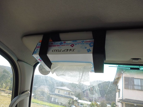 ティッシュBOX設置 車 2017年03月26日 ティッシュBOX設置と言っても大したことないのですが・・・。 よくカー用品店に行くと売ってる助手席の頭上の日除けにつけるタイプのティッシュカバーをまねてみた。 100均でゴムバンドにマジックテープがついてる奴を買ってきて、バイザーに巻き付けてティッシュを固定。 たったこれだけだけど、あると無しでは大違い。 場所も取らないし、お金もかからないし。 我が家の車には全車装備してます。 今までのキャンピングカー快適化 [0回]