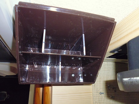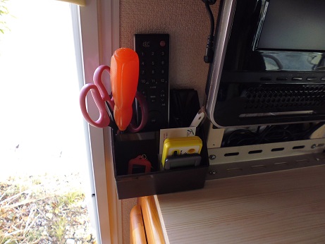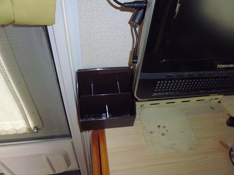 ペン立てを設置 車 2017年03月27日 車中泊ではよくハサミを使う。 食品の袋を切ったり、買ったものを切ったり。 マジックペンもよく使う。 同じものを買ったときに区別がつくように名前を書いたり。 なので、キャブコンになったらペン立てを設置、固定したいと思っていた。 100均でペン立てを買ってきて、木製の天板に木ねじで止める。 写真ではわかりにくいが、茶色いペン立ての右下の2本のねじで止めた。 こんな感じ。 これにはさみとマジック、ボールペン、ドライバー、リモコン、カップラーメン用のタイマーをいれて 完成。 大満足。 これでいちいち使う物をしまったり出したりしなくてすむ。 今までのキャンピングカー快適化 [0回]