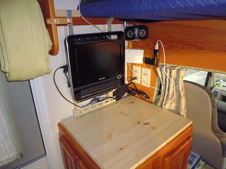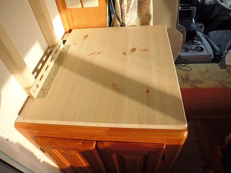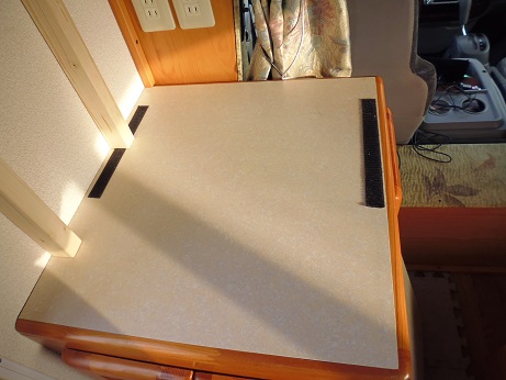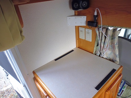 車内にTVの固定 車 2017年03月10日 この台にTVを固定するのですが、この台に問題があり、左右にマジックテープがついている。 前のオーナーが何かを固定するために着けていた物だとおもうのですが、両面テープではってあります。 このマジックテープがバンクベッドの乗り降りの際に靴下に張り付き非常に不愉快。 なので、剥がそうと思ったら、両面テープが強力で貼り付けた天板ごとはがれてしまう。 とても汚くなってしまうので、これも対策をする事にしました。 この状態から 自作ベッドの板と固定用の角材にステーを使って、壁に角材をつけます。 マジックテープが貼ってある台に新たな天板を ホームセンターで買ってカットしてもらった板に、マジックテープのメス(ピンクの奴)ねじで付けて、ひっくり返して 載せて 壁の角材とL型アングルで固定 で、TVを壁の角材につけて配線して完成。 ちと配線の取り回しがいまいちで気になりますが、これで走行中でもTVが見れる。 いちいち片付けをしなくても走行できる。 台の天板もきれいになり、快適。 天板にもねじ打ったり出来るようになったので、気軽に何かの固定が出来る。 今までのキャンピングカー快適化 [0回]