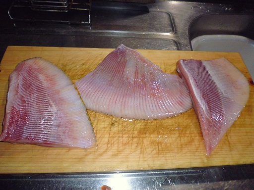 エイヒレ焼き 魚貝 2017年01月21日 エイヒレ焼き 味の評価 ★★★☆☆ 以前釣ったエイのヒレを干した物を冷凍してあった。 解凍してシンプルに焼いてみた。 軽く塩を振って魚焼きグリルで焼いた。 更に食べやすくする為に一口サイズに切った。 完成。 イメージは居酒屋などで食べるエイヒレだが、少し様子が違う。 何が違うかと言うと厚みが決定的に違う。 居酒屋とかのエイヒレは薄く食べやすいのだが、これは肉厚。 普通の魚の塩焼きなみに厚さ。 固くて食べにくいか?と思って食べたのだが。 あれ?? 柔らかい。 肉厚で周りはパリッとしてて中はジューシー。 軟骨も柔らかく歯ごたえ良く美味い。 え??居酒屋のエイヒレはいったいなんなの? 思ってたエイヒレとは違ったがそれ以上に美味しかった。 本当のエイヒレはこんなに美味いのね。 また釣ってきたいなー。 その他の食べ方 [0回]PR