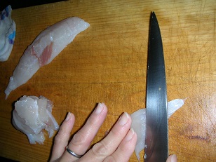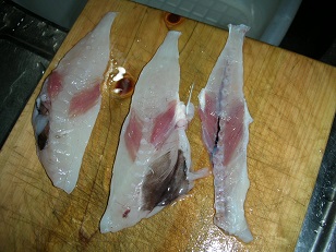 シロサバフグの刺身 魚貝 2017年12月02日 シロサバフグの刺身 味の評価 ★★★★☆ 去年初めて食べたシロサバフグ。 非常に美味かったのだが、似た容姿で毒サバフグなる物がいるらしく素人は判断が難しいとか・・・。 なので、しっかり見分けが出来ないと非常に危険な食材らしい。 ネットで色々調べてみると、尾びれの形、色など違いはあるらしい。 一番の違いは背中のトゲらしく 写真ではわかりにくいが背中のトゲが背ビレまで達してるのが毒サバフグらしい。 で、このサバフグはと言うと首の上あたりにトゲが集中しててそこから少しだけ背ビレまでボツボツトゲがある・・・・。 んんーーー、微妙っ!! 背ビレの特徴はほぼシロサバフグなのだがトゲが判断できない。 でもネットの写真で見ると毒サバフグのトゲは背ビレまでびっしりはえてる。 うちのサバフグはそこまでびっしりはえてない。 でも、迷ったら食うなとどこを調べても書いてある。 うーん、悩ましく迷ったが食う事にしました。 前回シロサバフグを食う時にも記事に書きましたが、背ビレやらトゲやらの前にネットの写真を見るからに、どう見てもシロサバフグと毒サバフグは容姿が全く違う。 ソウダの丸ソウダと平ソウダは似てると思うが、慣れれば一瞬で見分けがつく。 サバフグはソウダに比べてもはるかに容姿が違う。 これ間違えないだろっ!!ってのが私の結論です。 ただし、毒サバフグの実物を見た事ないので何とも言えませんが・・・。自己責任です。 まずは、ひれを切り取り皮をむき、キモを取り出します。 肝は美味いらしいのでどうしようか迷いましたが、一応食べるのやめときました。 身にもう一枚薄皮があるので剥ぎます。 三枚におろして 腹の骨を取り除き お刺身に切っていきます。 切ってる段階で弾力があり、それでいてもっちりしていて美味そうです。 完成です。 めんどくさいんで、皿に盛り付けてません。 ちなみにシロサバフグを調べていくと、水っぽくて刺身に向かないとか、そんなに美味しくないとの記事もチラホラ。 しかしそんな事ありません。 一口食べて幸せっ! フグそのもので美味しい。 弾力がありながら下に絡みつくような旨味。 日本酒と合わせるともう最高っ!! 誰だ!そんなに美味しくないなんて言ってるのは! うーん、でもチラホラそんな記事があるので、もしかしたら鮮度の問題かな? 釣りたてを食ってるから美味いのかもしれん。 いやぁ、ほんとにこういうのがあるから釣りはやめられないね。 翌日の今もピンピン元気にしてますので、今回のサバフグも毒サバフグではなくシロサバフグでした。 また食べたーい。 [0回]PR
