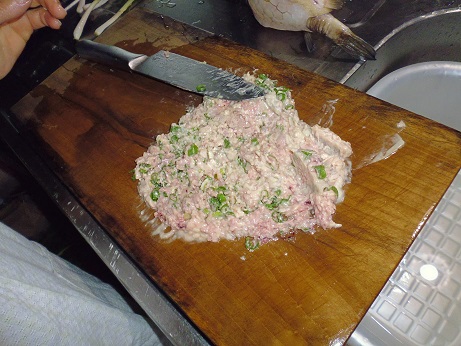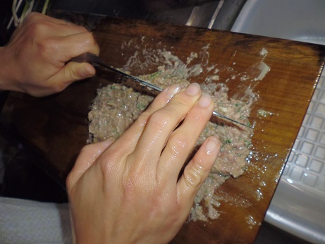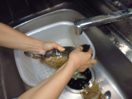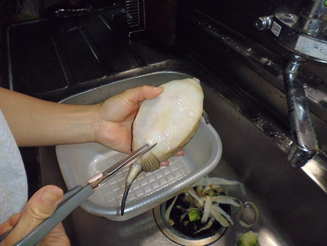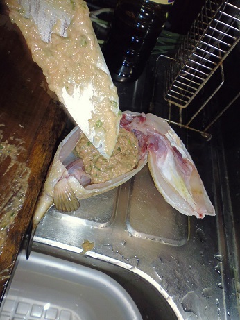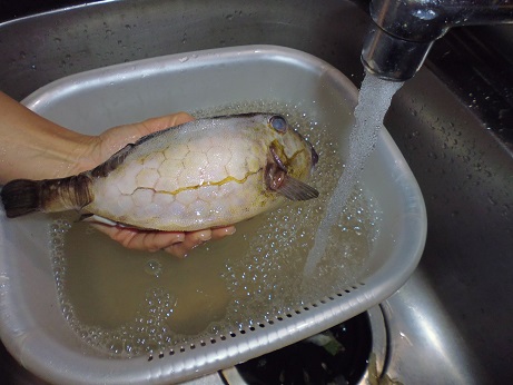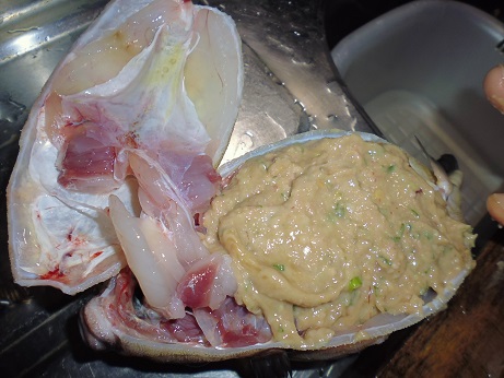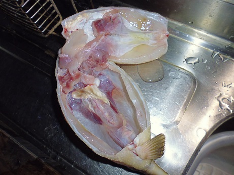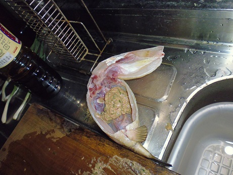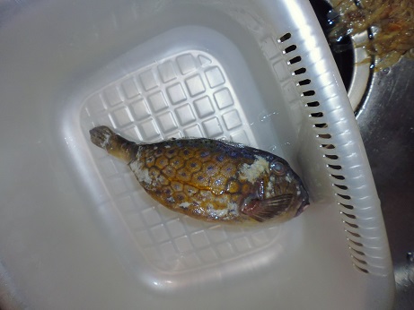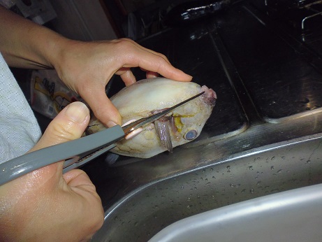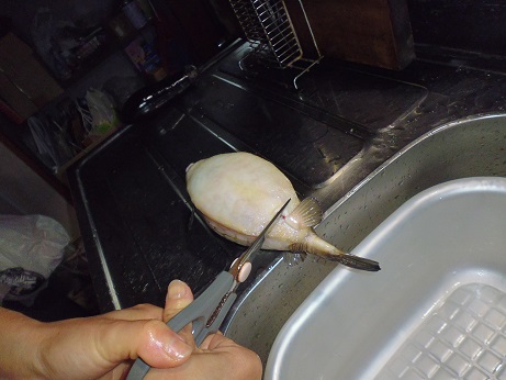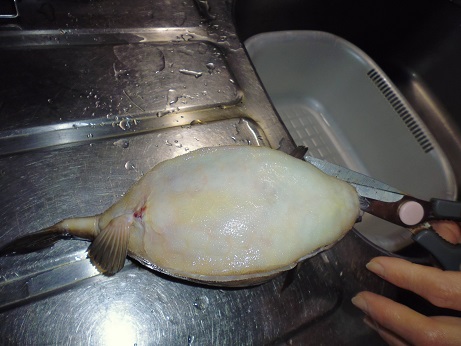 ハコフグの味噌和え 魚貝 2017年06月24日 ハコフグの味噌和え 味の評価 ★★★★☆ 釣りに行った際にぷかぷかと浮いて逆さまで泳いでたハコフグ。 きっと誰かが釣って捨てたものと思われる。 すかさず網ですくって拾ってきました。 ハコフグは美味なので我が家では人気なのですがいかんせん採れるハコフグは小さい。 大体15cmがいい所。 なので家族7人では数匹いた所でロクに食べれない。 でも今回のはでかい、25cmぐらいある。 このサイズになると大きさより太さがすごい。 期待に胸を膨らませ早速処理する。 まずたわしでゴシゴシ洗う。 すると、 これが・・・ 真っ白になっちゃう。 全体を綺麗に洗ったら 肛門からはさみを入れて蓋を取る腹を開ける。 チョキチョキと切っていく ・・・ のだが。 いつものサイズのハコフグはジョキジョキと気持ちよく切れるのだが いかんせん大きいせいか、厚みがあり切れない。 気合をいれて なんとか切っていく 蓋を開ける腹を開くと内臓が出てくる。 いつものハコフグでは小さくてわからない身の部分がたくさんある。 内臓を取り出し、肝だけ取っといて後は捨てる。 肝を取り出し、中身が身を残して空っぽに。 肝を軽くたたいてネギを刻む。 ネギを混ぜてたたく 更に味噌を加えてたたく 最後に醤油を少々加えてたたく そして腹の中に戻す こぼさないように 慎重に詰めていく お腹一杯に戻しました。 蓋をして ホイルに包んで トースターで焼く 出来上がり 肝油みたいのがたくさん出てる。 いつもは小さいせいかそんなに気にならないのに、大漁だ。 出来上がり嬉しくて夢中で食べてしまいこの先の写真を取り忘れました。 この大きさになると流石に食べれる身の部分が多く、肝も十分味わえる。 もう最高っに美味いっす。 なんでみんな持って帰らないのか不思議なぐらい。 まぁただフグなので、やっぱ自己責任って所で怖い物はあるかな。 実際ハコフグは無毒で普通に食べてる地方もある。 しかしながら近年毒のものもあるとか、ないとか。 最近今まで毒なんてなかったものとかが毒があったり、暖かい海にしかいなかった危険な生き物がいたり、おかしいね。 環境破壊、温暖化。どうなっちゃうの?とまじめに考えちゃう。 何にしろ、釣ってきた物を食べるのは基本自己責任ですね。 話がそれてめちゃくちゃになっちゃったけど、ハコフグは相当美味しいですよん。 その他の食べ方 [0回]PR