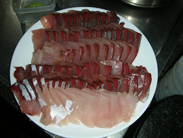 ヒラマサの刺身 魚貝 2017年12月27日 ヒラマサの刺身 いただいたヒラマサは半身を別の人にくれて、残りをうちに持ってきてくれました。 お刺身用の半身と別に 煮付け用のアラやら頭やらと 塩焼き用の切れ端たち。 綺麗に分けて処理してくれてありました。 ありがたや。 とりあえず、火を通すものは後回しで冷凍しました。 で、早速いただいた半身をお刺身にしました。 下の方の白い身がハラモです。 ヒラマサも今まで食べた事のない魚なので楽しみにしてました。 とうとう初のヒラマサ実食です。 身質はブリですね。 味は・・・。 うーん、ブリかなっ。 ブリより美味いと聞いていましたが今回いただいたのはワラサあたりと余り変わらないと思いました。 ただハラモは脂の乗りがすごかった。 トロトロです。 濃厚でしつこくない旨味の脂でした。 うん、なんだかんだ言って美味しかった。 その他の食べ方はこちら [0回]PR