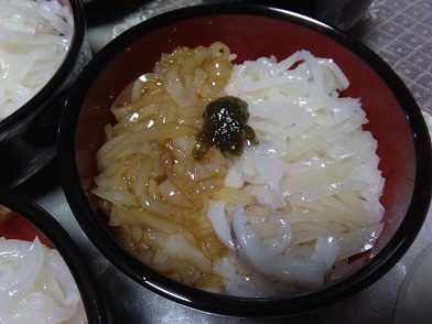 ヤリイカの2色丼、拾った海藻添え 魚貝 2018年03月20日 先日釣ったヤリイカは8杯中6杯をお刺身にしました。 半分は普通にお刺身にして、もう半分は漬けにしました。 せっかくなので酢飯にしてヤリイカ丼にします。 3倍は普通にお刺身、残りの3杯は漬けにするのでお刺身にした後、漬けダレ作りです。 まずは酒を一煮立ちさせて 醤油とみりんを酒と1:1:1でまぜて30秒火にかけて漬けダレの出来上がり。 このたれにイカを3杯分入れて漬けこみます。 すでに美味しそうです。 更に・・・・ 釣り場がいい場所取れなかったため、かなり浅い所で釣ってたので、よく根がかり気味でした。 そんな時に仕掛けについてきた海藻があったので、持ってきました。 名前もよくわからぬ海藻。なんだかゆるい藻屑のような奴です。 軽くサッとゆでてみました。 あっという間に緑色に変わっていきます。 しかも溶けてしまいそうです。 こんな感じになりました。 さて酢飯も用意したので家族七人分のどんぶりを作ります。 7人前の出来上がり。 物凄い量です。 こんな感じです。 左側がイカ漬け、右が普通のお刺身。 そして真ん中の海苔みたいのが謎の海藻です。 イカのお味はもう語るまでもなく美味い。 漬けも文句なく美味い。 幸せすら感じるイカたっぷり丼です。 さて、気になる謎の海藻はと言うと・・・・。 うーん、全く味がないですね。 醤油をたらして食べればそれなりに美味しいです。 あってもなくてもどちらでも良い感じです。 まぁ、色づけと、少しは栄養があるんではないかと思うので良しとします。 いやぁ今年も冬のヤリイカ堪能しました。 美味しかったー。 海の恵みに感謝です。 朝いか沖漬け 国産の朝獲れイカ まるごと1杯入 【いか/イカ/スルメイカ/沖付け/しょう油/朝イカ】 [0回]PR