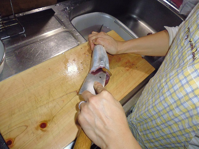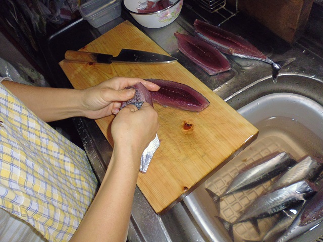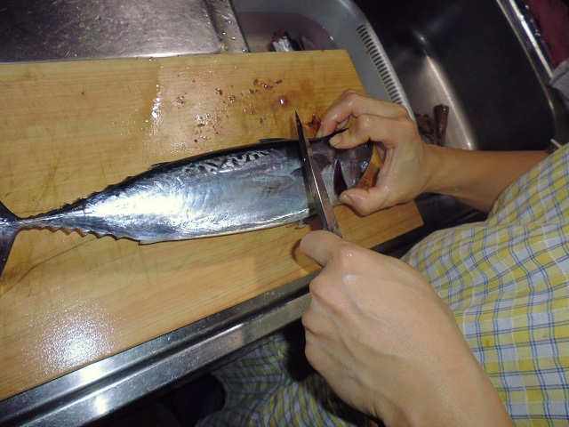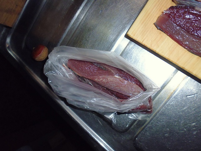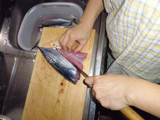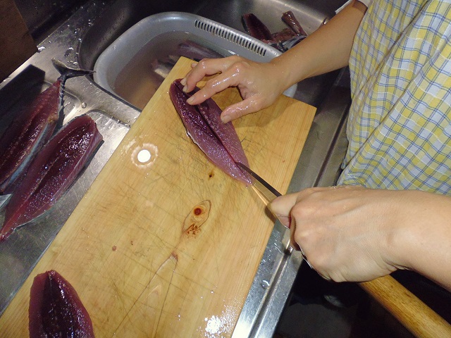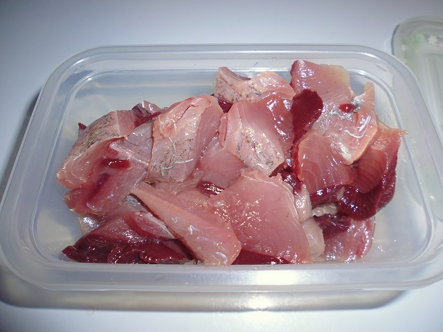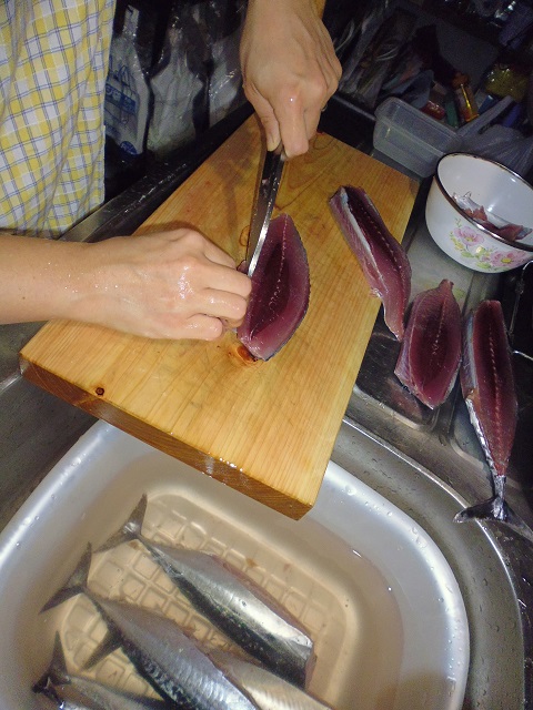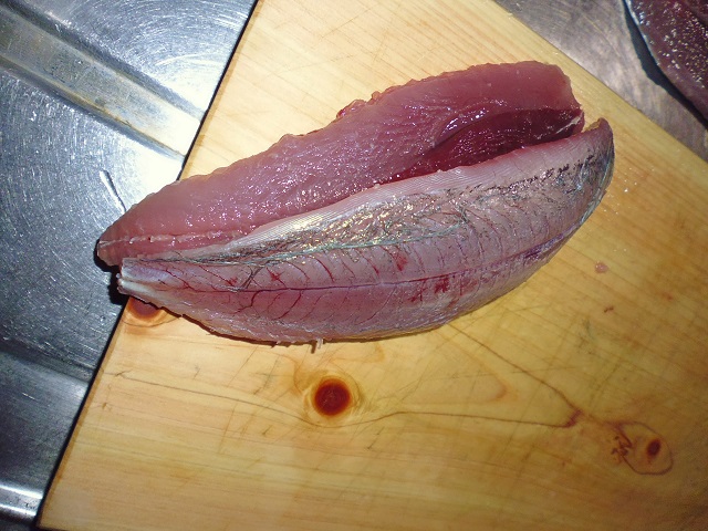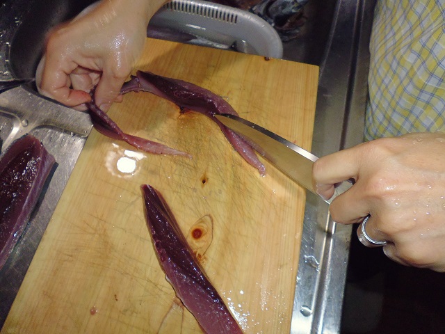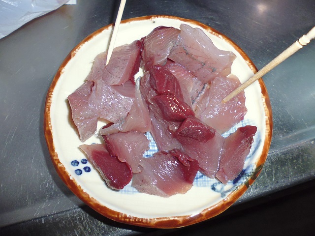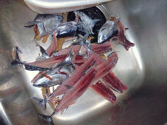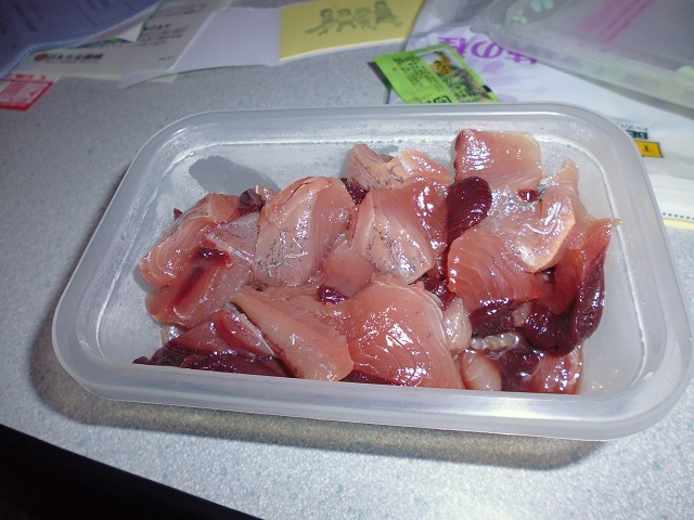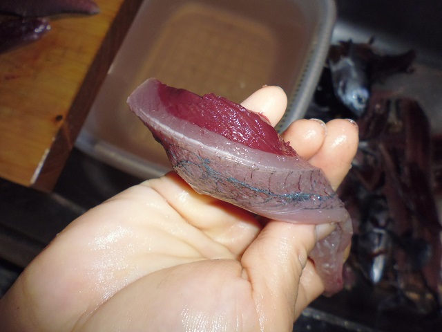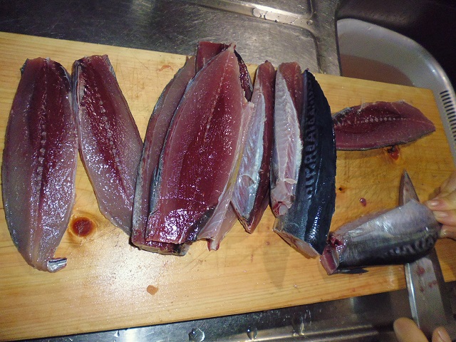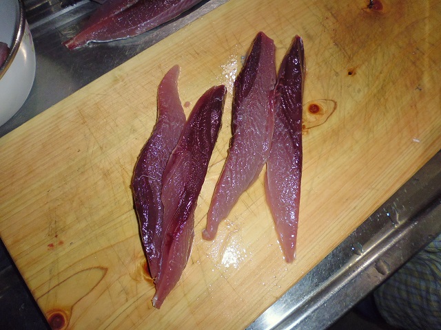 丸ソウダの刺身 魚貝 2016年10月01日 丸ソウダの刺身 味の評価 ★★★★☆ 先輩が釣りに行ってきて、丸ソウダをくれた。 釣果は西伊豆方面、ボートでかご釣り。 メジマグロ、真鯛、ソーダなど。 早速捌く。 頭を落とし ハラモを切り取る。 三枚におろし 皮を引く 中骨を切り取り まずは今晩のつまみ完成。 とりあえず、つまみを確保したら、あとはひたすらさばく。 捌いてたら、やたら脂乗りのいい個体を発見。 10匹に一匹ぐらいノリのいい個体がいる。 あまりに美味そうなので その場でみんなで試食。 もう最高! これがあるから釣りはやめられないと思う瞬間。 (自分が釣りに行った訳じゃないけど・・・・。) さばき終わって夜のつまみにさっきのお刺身をいただく。 ミョウガがあったので、ミョウガと生姜、土佐醤油で頂く。 ミョウガ、生姜と相性抜群! 釣りたての買って食えない美味しさ。 最高っ!! その他の食べ方 [0回]PR