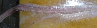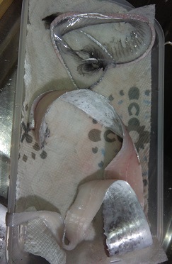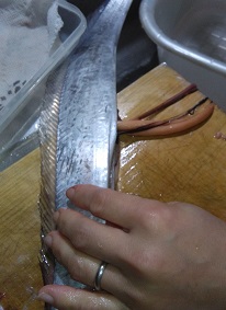 久しぶりに釣った太刀魚で太刀魚の刺身 魚貝 2018年11月07日 数年ぶりに釣った太刀魚です。 折角新鮮なので当然お刺身ですよね。 太さは指3.5本分。 まぁまぁなサイズです。 ちなみに我が家では太刀魚はほとんど捨てる所ないです。 頭と内臓以外は全部使います。 頭を落として内臓を出したら卵を持ってました。 卵はからすみにしましょう。 身とひれと 骨です。 身をお刺身にしました。 太刀魚のお刺身ってきれいで獰猛な顔からは想像できないです。 色は鯛とかみたいにきれいな透き通った白身で、歯ごたえもあり味は甘みを感じる上品かつ濃い味ですね。 まぁ他にない独特な味わいです。 とにかく太刀魚のお刺身は本当に美味しいと思います。 さて太刀魚をさばく過程で色々な部位を取ってありますが、 これはひれです。 太刀魚は背びれが立派ですよね。 透明で透き通ってて美しいです。 こいつを干します。 カラカラになるまで干したら出来上がり。 後は軽く炙って日本酒に浸して太刀魚のひれ酒として飲む予定です。 これだけひれがデカいと何倍分になるか・・・・。 また飲みすぎちまうなぁ。。。 【お刺身用】淡路産(釣)タチウオ約500g中サイズ1本(たちうお・太刀魚・つり) 価格:1980円(税込、送料別) (2018/11/5時点) 楽天で購入 [0回]PR