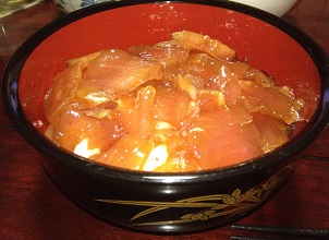 今日も簡単美味しい マグロの漬け丼 魚貝 2018年12月28日 以前いただいて冷凍しておいたマグロ君。 コストコのグラッドプレスンシールで真空パックで冷凍してあったものです。 グラッドプレスンシールについては過去記事を見てね。 グラッドプレスンシールの真空パックは本当に有効か?冷凍のカツオのたたき コストコのGLAD Press'nSeal(グラッド プレスンシール)でローコストな真空パックに挑戦 さて今回も真空にしてあったので鮮度は冷凍したのに中々な物です。 今回はマグロ漬けにしました。 漬けダレの作り方はこちらを見てね。 お刺身の漬けタレの作り方 たれを混ぜ混ぜ。 そしたら冷蔵庫でしばらく寝かせて、ご飯に盛り付ければ完成です。 今回ご飯は酢飯にしました。 具沢山のマグロ漬け丼です。 これって説明の必要がないと思いますが、美味しいです。 マグロも生臭くなく、漬け特有のトロっとした口当たりのマグロと酢飯の相性は抜群です。 いただき物で美味しく安くマグロ漬け丼を家族7人でむしゃむしゃ食ってますが、もしお店で食べたら7人前いくらするんだろう? とにかく今日も美味しくいただきました。 簡単調理 きはだまぐろ漬け 80g×5Pセット 漬け丼 マグロ 鮪 づけ どんぶり おさしみ 価格:1350円(税込、送料別) (2018/12/26時点) 楽天で購入 [0回]PR