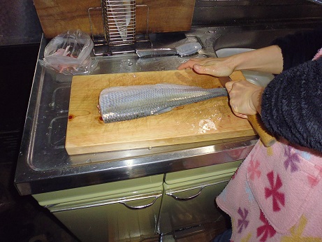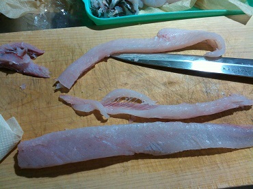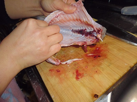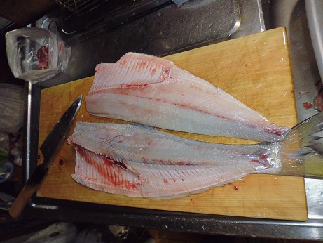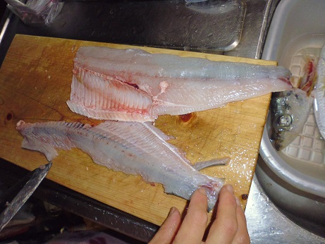 瀬戸内の魚 ヒラの刺身 魚貝 2017年03月02日 ヒラの刺身 味の評価 ★★★☆☆ これまた見た事のない魚、ひら。 魚体のわりにヒラと言うだけあって平べったい。 うろこも薄くゆるい、イワシのようにツルツル取れてしまう。 そして口が受け口でちょっと不細工。 なかなか立派なサイズなので1匹は刺身、もう1匹は2枚におろして塩焼きにしよう。 まず、刺身にして食う。 三枚におろして さくにして 出来上がり。 腹側と背側を分けてあります。 と、刺身になりましたが、実は結構大変でした。 さくにして普通に刺身に切ろうとしたら、普通の魚と違って小骨がそこら中に入ってる。 取り除こうと包丁を入れてみたが、沢山すぎて小骨を包丁でそぐことは不可能。 なら、骨抜きで抜こうと思ったらグニャグニャして抜けない・・・・。 うーん、困った。 ネットで調べたらやっぱ小骨が多いらしい。 骨切りをするような記事も見かけたので、真似して骨切りをしてみる。 ただ、素人なので、細かく骨切りするにも限界がある。 それでも何とか骨切りをしてやっとお刺身の完成です。 で、問題のお味の方はと言うと おー、うまーい。 ん?んん? んー、小骨が邪魔っ! 口当たりが悪い。 それでも小骨がたくさんある事を前提によく噛んで食べれば結構食べれる。 でも、やっぱり小骨が気になるなぁ。 味はいいんです。ただ小骨が・・・。 これはあれです、関東ではあまり受け入れられない系だと思います。 せっかく味がいいのにちょっと残念なお魚です。 味がいいので食べ方を工夫すればいいかな。 今後の課題ですな。 その他の食べ方 [0回]PR