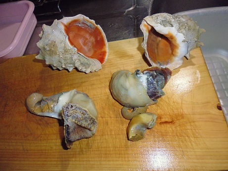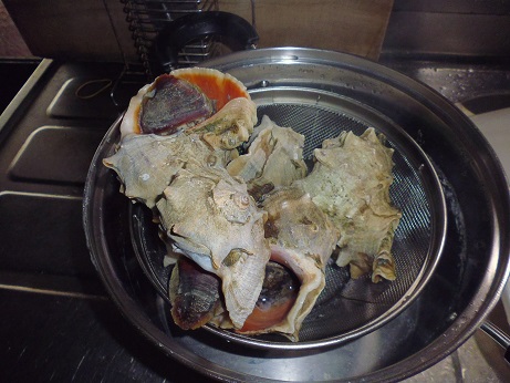 瀬戸内の魚貝 チリメンボラの塩ゆで 魚貝 2017年03月03日 チリメンボラの塩ゆで 味の評価 ★★★☆☆ 一番何だか分からずに調べまくったのがこの貝。 やっとこれであろうと思うのがチリメンボラ。 でも違うかもしれない。 チリメンボラで検索してもネットにはロクに情報がない。 まぁ、この手の貝は塩ゆでにしてしまえば食えるだろう。 磯物拾いに行っても拾った貝はみんな塩ゆでで食べてしまう。 一応毒消しに梅干入れて 塩ゆで 茹で上がり 貝から身を取り出す。 サザエのように慎重に取り出そうとすると、つるっと全部取れてしまった。 あら?手ごたえなく取り易い。 もう一個も同じように取り出そうとしたら、内臓?わた?が切れてしまった。 あー、美味しい所が中に入ってしまうっ!! と思ったら、中に入らずそのまま切れた所が貝から顔を出している。 うーん、取り易い。 どんなへたくそでも先まで取り出せる。 こりゃぁ食べられるために生まれてきたような貝ですね。 スライスして 出来上がり。 とりあえず、粒が大きいので2個分。 後は冷凍して置いて後日いただきます。 お味の方は。 まずは、身の厚い部分から。 おっ! サザエとかを想像してたけど全然違う。 食感と味はアワビに近い。 でいて、アワビより味が濃い。 これ美味しー。 魚のおまけみたいに思ってた貝が実はかなり美味しい。 いろんな場所を食べてみると、歯ごたえがあったり、ワタのなかに貝柱にように見える部分があって、そこはチーズのような口当たり。でも味がない。 ワタも濃厚で美味い。でも臭みは全くない。 いやぁ、美味いそこの貝。 喜んで食ってたら、突然 「っ!!!!!!!!!」 刺すような苦み!! 「ごほっごほっ」 苦すぎてむせる。 うわー!!お茶を飲む。 ご飯を食べる。 何をしても消えない・・・・。 これは危険なんじゃっと思ってたら突然何事もなかったかのように苦みが消える。 多分30秒ぐらいの出来事。 でも、他に食べてる人は何でもない。 んー、なんだったんだろ?? と考えていたら一人が突然 「ゴホッゴホ」 むせてる。 「にがっ!!」 叫んでる、悶絶してる。 まったく同じくだりで約30秒。 「あれ?消えた、苦み・・・。」 とりあえず二回だけと言うか、2か所だけすっごい苦い所があった。 一つの個体が苦い物を持っててそれを半分づつ二人が食ったか? それとも個体一つに一か所苦い部分があるのか、定かではないが。 もしかして毒がある部分があるんじゃ?と思いましたが、その後も二人とも何事もなくピンピンしてます。 とりあえず、かなり美味しい貝なので★5つにしたいんだけど、苦みの部分が強烈で謎なので★3つにしときます。 その他の食べ方 [0回]PR