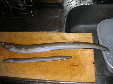 アナゴの蒲焼風 魚貝 2017年08月31日 アナゴの蒲焼風 味の評価 ★★★☆☆ 今回アナゴが2匹釣れたのでかば焼きにする。 釣りたてのアナゴの蒲焼はウナギにも負けない美味さ。 真アナゴの方が美味いと言うが我が家では別に黒アナゴでも全然かまわない。 まずは背開きにして 一匹は小さいのでかわいいサイズ。 鍋に並べてタレ(みりん、醤油、砂糖、ほんだし)と一緒に火を通します。 頭やアラも出汁が出るので一緒に火を通します。 出来上がり。 頭は食べないのですが、若干身があるのでつつきます。 少しだけミニアナゴ丼。 アナゴはトロトロでお上品な白身。味がしっかりしみて美味しいです。 ついでに美味いのがタレ。 結構アナゴの出汁が出るのでこの汁をかけただけでもご飯が食えてしまう。 美味しかったけど、家族みんなで食うには大きいアナゴがあと2匹ぐらい欲しいな・・・。 今度は頑張ってもっと釣りたいなー。 その他の食べ方 [0回]