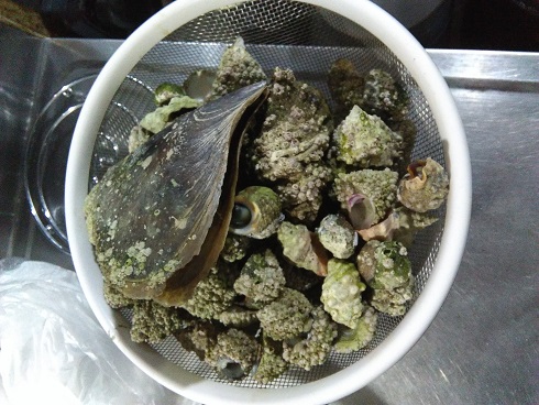 磯物の塩ゆで 魚貝 2017年07月20日 採ってきた磯物たち。 さっそく塩ゆでにしました。 梅干を入れてグツグツ煮ます。 出来上がり。 イイッコ、にしがい、スガイなどなど。 うーん、美味い。 やっぱり磯物は最高。 ちなみに初めてとったタイラガイは。 絶品!! 特に貝柱がホタテみたいに美味いっ! 今度からこれを頑張って探してみよう。 その他の食べ方 [0回]