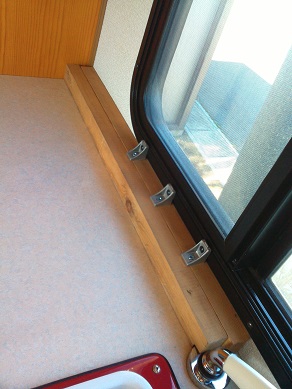キャブコンにレンジの固定 車 2017年03月30日 キャブコンに1500wのインバーターがついているので電子レンジやトースターが使える。 しかし、使うたびにいちいち片付けなければならず面倒くさい。 このスペースに置いているのだが、面倒臭いからと言ってここに置きっぱなしでは、走行中に何かあった時にレンジがすっ飛んでしまう。 下に滑り止めをひけばいいかとも思ったが、事故や急ブレーキの際には浮き上がってしまい意味がないだろう。 ステーか何かで台に止めてしまえばいいのだが、きれいな天板に穴をあけたくない。 と言う事で試行錯誤しながらレンジの固定をする事にした。 まずは窓枠に沿って角材を這わせる。 角材が動かないように窓枠とステーで固定するつもりだが、更に水道の部分でも固定できるように 水道の根元にハマるように先っちょを削る。 こんな感じにぴったり。 うーん、職人の匠の技だな。なんて思いながら でもここまでに相当時間かかってます。 少し削ってはあててみて、足りない所をまた削っての繰り返し。 削りすぎるとアウトなのでちょっとづつ。 まぁしょせん素人なので・・・・。 そしてもう一本。 もうこれだけで自己満足。 燃え尽きました。 全体はこんな感じ。 ここから窓枠のねじにアングルで止めていきます。 三か所止めて、角材とは木ねじで。 ようやく第一段階完成。 ここに滑り止めシートを置いて 横面にも角材を置いて 角にもLアングルをつけます。 電子レンジの後ろ下の左右についてるねじを利用してアングルで角材に固定します。 レンジと角材を当ててみてちょうどよくなるようにアングルをハンマーでたたいて調整します。 ちょっとづつ曲げていき、結構苦労した。 レンジの左右に取り付け 今度は横の壁にも角材をはわせます 上下ピタピタの長さに切って上下に小さく切った滑り止めを噛ませてハンマーでたたき入れました。 ステーで固定。 そうそう、固定やらに使ってるステーやアングルですが、買って来たものではありません。 うちにあったものを流用したり、捨てるものを解体して部品を取っておいたり、そんな物を使ってるので、なんでそんな形の奴を使うの?みたいのがありますが気にしないでください。 さて電子レンジを固定します。 先ほどのステーを窓枠につけた角材に固定して出来上がり。 これで電子レンジはいつでもコンセントをさせば使えるようになりました。 続いてトースターも固定しますが、続きは明日。 今までのキャンピングカー快適化 [0回]PR