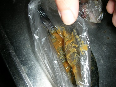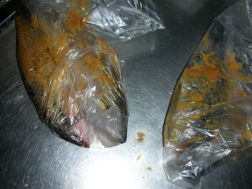 塩漬け(ソウダ、イサキ、アジ) 魚貝 2017年11月29日 1年以上前から冷蔵庫に眠ってた魚がある。 塩漬けにしてそのまま冷蔵庫で保管していたのだが、食えるのか?? 以前、1年近く保管していた塩漬けは美味しく食えた。 しかし1年以上寝かせた塩漬けは初めてだ。 塩漬けしてあった魚はソウダ、イサキ、アジだ。 まず、塩抜き。 水を変えながら2-3時間水にさらす 焼いてみた。 写真左は3本ソウダ、右の1匹がイサキ。 アジは焼く前から何だか臭くて、焼いてみたが臭みが消えず、身もゆるく焼いたら形が崩れてしまった。 少しつまんでみたが、変な味がした。 「うん、いたんでるね」 食えませんでした。 しかし、ソウダとイサキは食えました。 でもソウダはもしかしたら怪しいかも??と疑問ありのお味。 イサキはうまい具合に熟成?して美味しかった。 結論からすると1年以上寝かせるのはやめた方がいいと言う事。 多分安心して食えるのは半年ぐらいまでかな?? 今度から塩漬けしたら早めに食べる事としよう。 その他の食べ方 [1回]PR