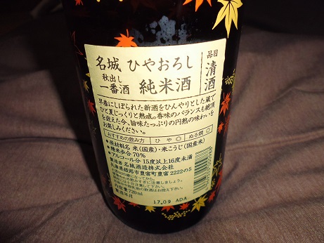 日本酒 名城ひやおろし その他料理 2017年11月02日 先日酒のディスカウントショップに行ったところ、こんなのがあった。 美味そうだけど、値段が1000円。 安いけどどうなんだろ?と興味半分で買って来た。 なんだかおいしそうでしょ。 まぁ安い酒だからあんまり期待はしてないけど、でもいい香り。 なんて思ってたら、結構うまい。 あら?お値段以上のお味。 あっという間に飲んじゃいました。 飲みやすいお酒でした。 その他の料理、外食 [0回]