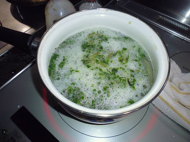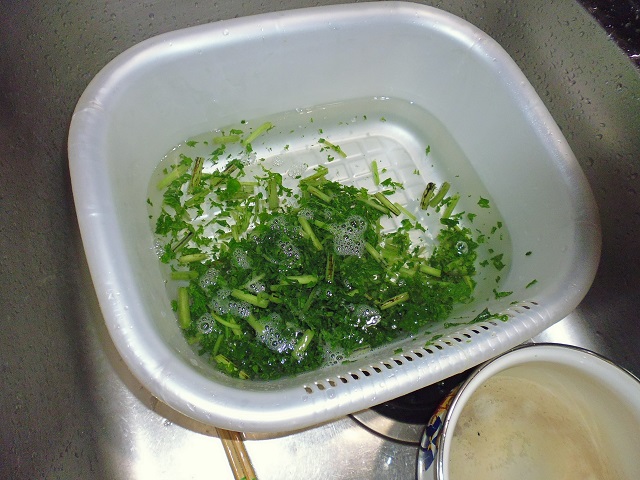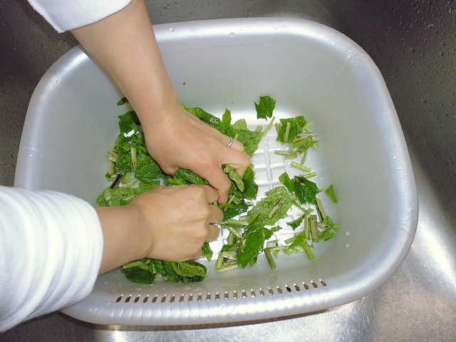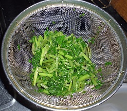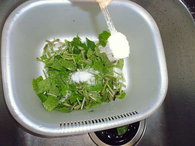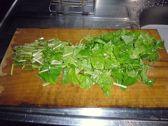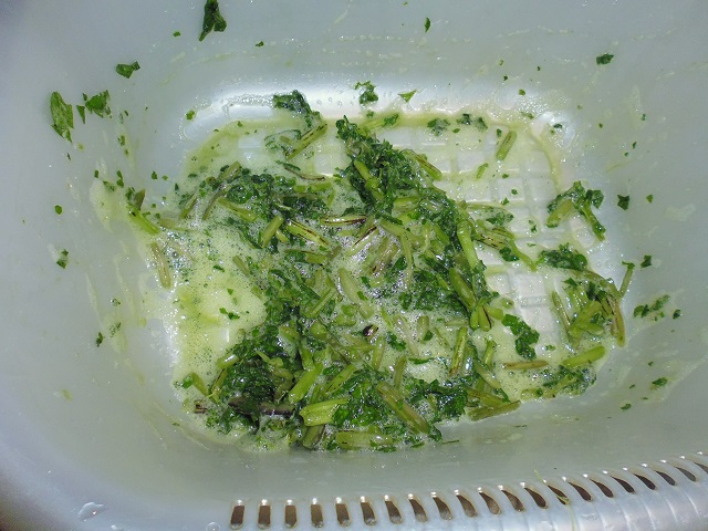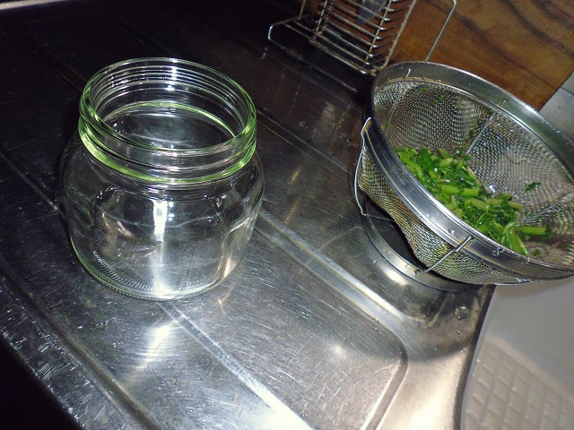 葉わさび、茎わさびのおひたし 山菜、野菜 2016年07月24日 葉わさび、茎わさびのおひたし 味の評価 ★★★★☆ ワサビの葉と茎をいただいた。 良く頂くのだが、美味しくワサビらしくピリッと辛みが効いたおひたしを作るには少しコツがいる。 そんな難しい事ではないのだが、手を抜くと美味しくならない。 洗って 刻んで 塩をかけて 塩もみする 十分塩もみしたら お湯を80度に沸かして 10秒間茹でる すぐに冷水で冷やし 水をきる ビンを用意し みりん 1 と 昆布つゆ 1.5を入れて 葉わさびをギューと絞って ビンに入れる。 蓋をして密閉して一晩寝かせて出来上がり。 ポイントは塩もみ、80度のお湯に10秒。 すぐに冷水にあてる。 ギューと絞ってワサビをいじめる。 密閉して空気に触れさせない。 上記を守ればピリッと辛いおひたしが出来ます。美味しいよー。 その他の食べ方 [0回]