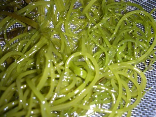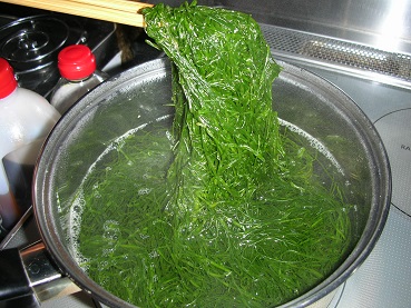 西伊豆方面に磯物を拾いに行ってきた 海藻編 釣り、磯物採り 2018年05月11日 西伊豆に磯物を採りに行った際に、海藻も拾ってきた。 名も分からないが食べれる物もあるだろうと思い挑戦してみることにしました。 まずはわしゃわしゃと、ほうきのケバケバした海藻。 大量にあったし、簡単に取れるところにあったので多めに採ってきました。 触った感じは硬くてスジっぽそうです。 茹でてみたら見事な緑色で美味しそうな色になりました。 心なしか柔らかくなっているようです。 食べてみると、ゴワゴワです。 味はない上に口当たりが良くないです。 次は茶色い丸くて長い海藻です。 茹でたら緑色になりました。 なんだかそうめんみたいです。 味は・・・・?? おっこれはいけます。 とろけるような、ぬるっとした口触りと海藻の旨味があります。 味噌汁なんかに入れても美味しそうです。 後は少量ですが この二つの海藻です。 わかりにくいですが茹でたらきれいな緑色になりました。 どちらも歯ごたえ良く海藻らしい美味しさです。 以上が採ってきた海藻ですが、最初のゴワゴワした海藻以外は美味しく食べれました。 海藻ってたいてい茹でれば食べれると思うんですけど、口当たりの悪いのは美味しくないですね。 あと注意しなければならないのは、採ってはいけない海藻も場所により多々あると言う事。 でも私の場合種類とか見分けがあまり海藻については詳しくなく、採ってはいけない物を採ってるのか、そうでないのかもよくわかりません。 まぁ、とってもちょこっと一回分ぐらい取るだけなので大丈夫かな? [0回]