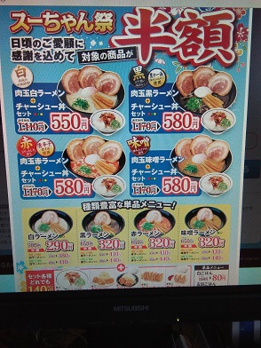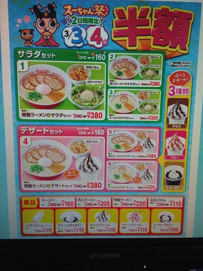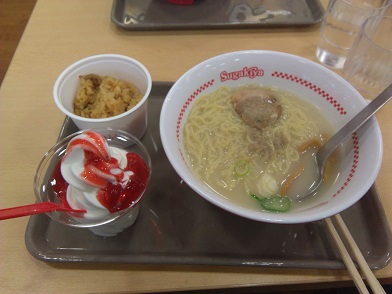 スーちゃん祭で半額のスガキヤ その他料理 2018年03月07日 先日静岡県静岡市まで寿がきやでスーちゃん祭の半額セールだったので行ってきました。 大変おいしゅうございました。 夕飯で食べたのですが、翌日のお昼にスガキヤに行ってきました。 こちらでもスーちゃん祭で半額です。 静岡の久能山にまぁまぁ近い店舗で、ホームセンターのエスポットに併設されたお店でした。 半額のせいかスッゴイにぎわってます。 座る席がない・・・・。 注文もめっちゃ並んでる。 何とか席を確保してラーメンを注文。 今回は ラーメン・デザートセットと 特製ラーメン 普段は節約してセットは頼まないし、ラーメンも特製ラーメンにする事はないのですが、今回は贅沢に注文しました。(半額だけど) ラーメンはいつもの和風豚骨でおいしいですねー。 五目御飯もまぁまぁ美味しいです。 アイスも普通です。 このセットで380円は安いですねー。 特製ラーメンはチャーシュー増量+温玉が付きます。 美味しいですけど、普通のラーメンで十分だったかな?と言う感想です。 スガキヤは安いのよく行くのですが、さらに半額となると激安です。 お安いお店は助かりますね。 (生めん)Sugakiyaラーメン6食セット 本日も美味しくいただきました。 [0回]