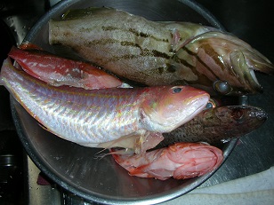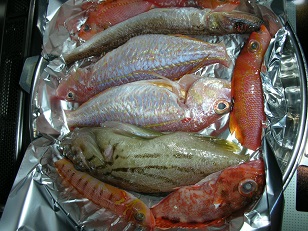 酒蒸し(ハタ、エソ、イトヨリ、サクラダイ、カサゴ) 魚貝 2018年01月11日 先日釣った魚たち。 残りの魚は酒蒸しにしました。 ハタ、エソ、イトヨリ、サクラダイ、カサゴと大小様々です。 まずは、うろこと内臓を処理してアルミホイルをひいたフライパンに並べます。 玉ねぎとレモンを乗せ酒蒸しにします。 そして出来上がり 玉ねぎのせいで魚が全部見えません。 さて、それぞれの魚を食べ比べしましょう。 まずはイトヨリです。 白身の魚の中でもお上品な味の魚ですので酒蒸しは相性抜群。おいしいです。 思ったとおりの味です。 そしてハタ。 この魚もお上品な高級魚ですので、イトヨリと同じく裏切りません。おいしー。 お次はサクラダイ。 ボート釣りでは嫌われる外道なお魚ですが、我が家では人気のおいしい魚。 何度も食べてるので美味しさは実証済みです。 毎回思うのですがおいしい魚なのに残念なのが大きくても15cmぐらいにしかならない事です。 その為、食べる為に処理に手間がかかる割に食べれる部分が少ないので、ボート釣りでは大体釣った瞬間に捨てられます。 次はカサゴです。 歯ごたえと言うか弾力があっておいしいです。 カサゴもどう調理してもおいしい魚ですね。 最後にあまり食べたくないエソ。 この魚も嫌われる外道ですね。 ただし大型の物は蒲鉾にするとすごくうまいです。 小さいと基本的に小骨が多い魚なので食べにくく嫌われます。 食べにくいかなーと思い恐る恐る食べてみると、 ん?これはっ!! 味が濃く酒蒸しにしても味がしっかりしている。 おいしー。 結構ほかの魚たちも美味しいといわれていて実際うまい魚たちなのですが、その魚たちと比べても今回の酒蒸しの中では一番美味しい。 小骨も少し当たりますが味は抜群です。 エソは意外だったなー。 今回も美味しい魚たちに感謝です。 [0回]
